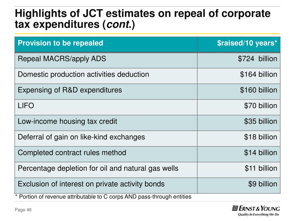 Highlights of JCT estimates on repeal of corporate tax expenditures (cont.) * Portion of revenue attributable to C corps AND pass-through entities