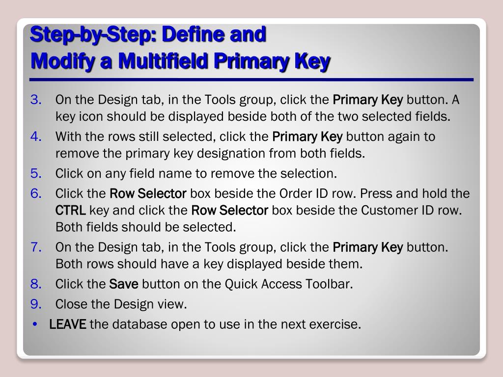 Step-by-Step: Define and Modify a Multifield Primary Key • On the Design tab, in the Tools group, click the Primary Key button. A key icon should be displayed beside both of the two selected fields. • With the rows still selected, click the Primary Key button again to remove the primary key designation from both fields. • Click on any field name to remove the selection. • Click the Row Selector box beside the OrderID row. Press and hold the CTRL key and click the Row Selector box beside the Customer ID row. Both fields should be selected. • On the Design tab, in the Tools group, click the Primary Key button. Both rows should have a key displayed beside them. • Click the Save button on the Quick Access Toolbar. • Close the Design view. • LEAVE the database open to use in the next exercise.