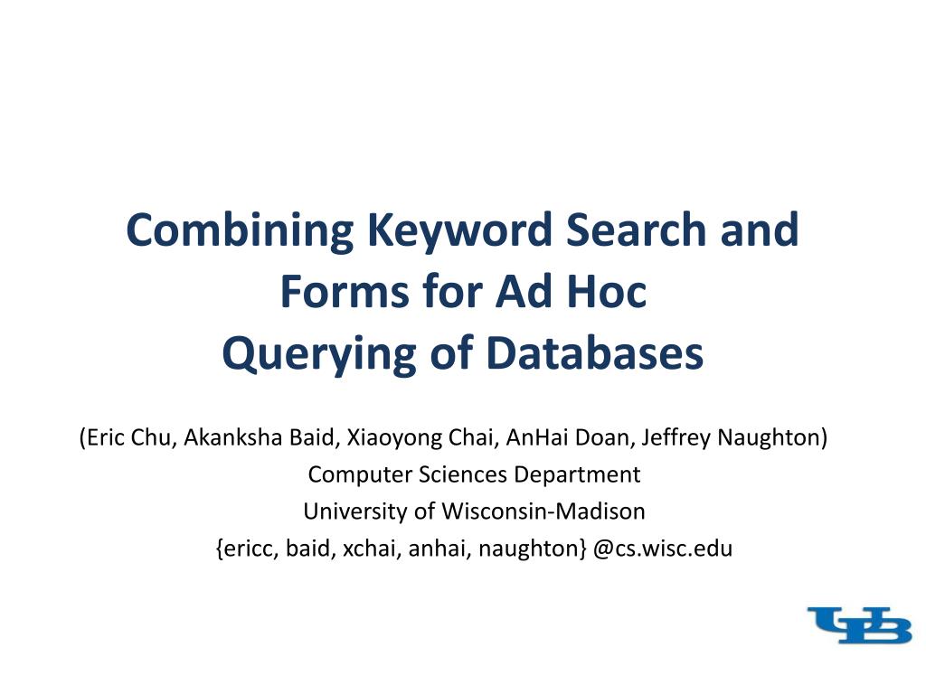 Combining Keyword Search and Forms for Ad HocQuerying of Databases (Eric Chu, Akanksha Baid, Xiaoyong Chai, AnHai Doan, Jeffrey Naughton) Computer Sciences Department University of Wisconsin-Madison {ericc, baid, xchai, anhai, naughton} @cs.wisc.edu