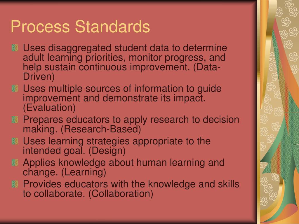 Process Standards • Uses disaggregated student data to determine adult learning priorities, monitor progress, and help sustain continuous improvement. (Data-Driven) • Uses multiple sources of information to guide improvement and demonstrate its impact. (Evaluation) • Prepares educators to apply research to decision making. (Research-Based) • Uses learning strategies appropriate to the intended goal. (Design) • Applies knowledge about human learning and change. (Learning) • Provides educators with the knowledge and skills to collaborate. (Collaboration)