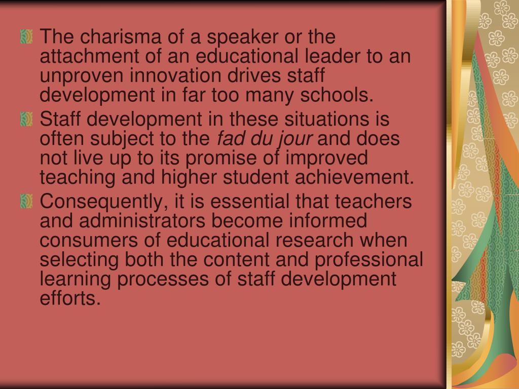 The charisma of a speaker or the attachment of an educational leader to an unproven innovation drives staff development in far too many schools. • Staff development in these situations is often subject to the fad du jour and does not live up to its promise of improved teaching and higher student achievement. • Consequently, it is essential that teachers and administrators become informed consumers of educational research when selecting both the content and professional learning processes of staff development efforts.
