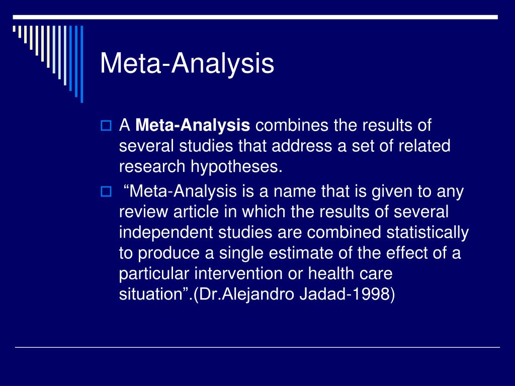 Meta-Analysis • A Meta-Analysis combines the results of several studies that address a set of related research hypotheses. • “Meta-Analysis is a name that is given to any review article in which the results of several independent studies are combined statistically to produce a single estimate of the effect of a particular intervention or health care situation”.(Dr.Alejandro Jadad-1998)