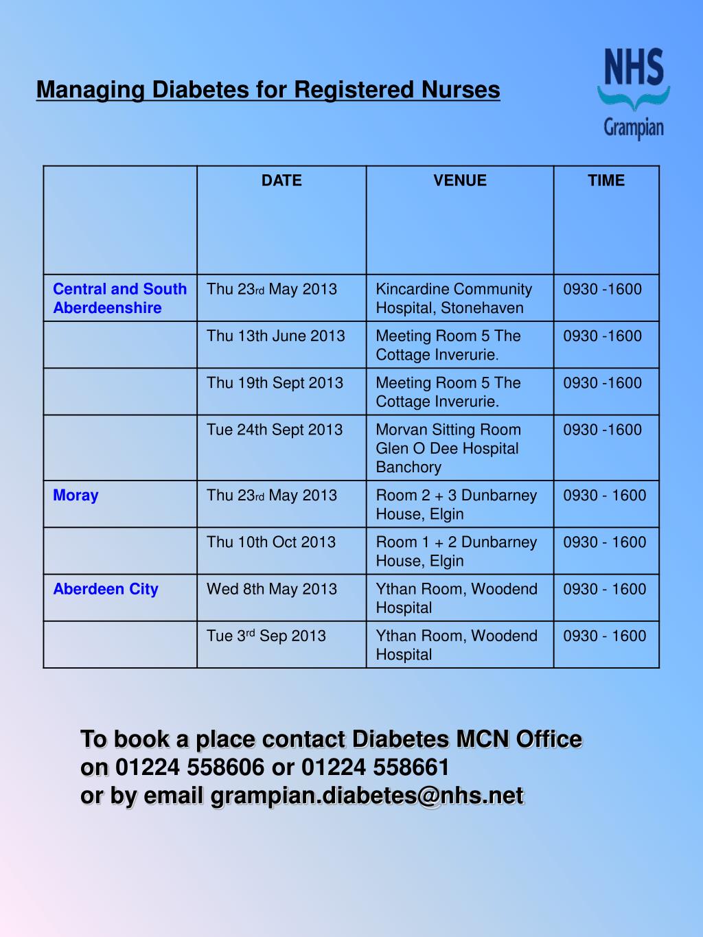 Managing Diabetes for Registered Nurses To book a place contact Diabetes MCN Office on 01224 558606 or 01224 558661 or by email grampian.diabetes@nhs.net