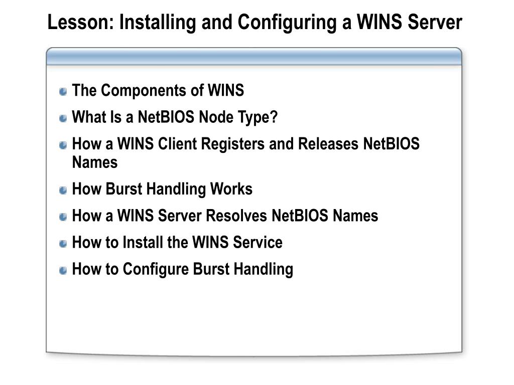 Lesson: Installing and Configuring a WINS Server • The Components of WINS • What Is a NetBIOS Node Type? • How a WINS Client Registers and Releases NetBIOS Names • How Burst Handling Works • How a WINS Server Resolves NetBIOS Names • How to Install the WINS Service • How to Configure Burst Handling