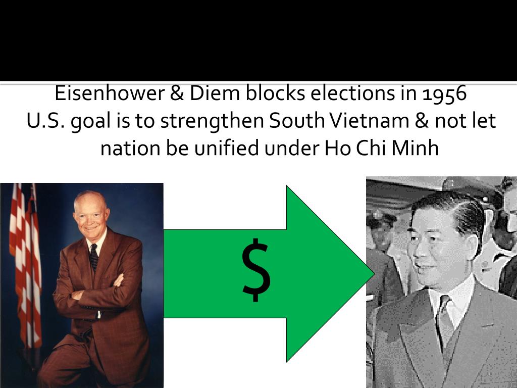 Eisenhower & Diem blocks elections in 1956 U.S. goal is to strengthen South Vietnam & not let nation be unified under Ho Chi Minh $