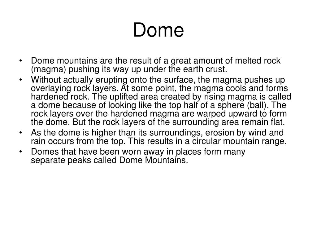 Dome • Dome mountains are the result of a great amount of melted rock (magma) pushing its way up under the earth crust. • Without actually erupting onto the surface, the magma pushes up overlaying rock layers. At some point, the magma cools and forms hardened rock. The uplifted area created by rising magma is called a dome because of looking like the top half of a sphere (ball). The rock layers over the hardened magma are warped upward to form the dome. But the rock layers of the surrounding area remain flat. • As the dome is higher than its surroundings, erosion by wind and rain occurs from the top. This results in a circular mountain range. • Domes that have been worn away in places form manyseparate peaks called Dome Mountains.