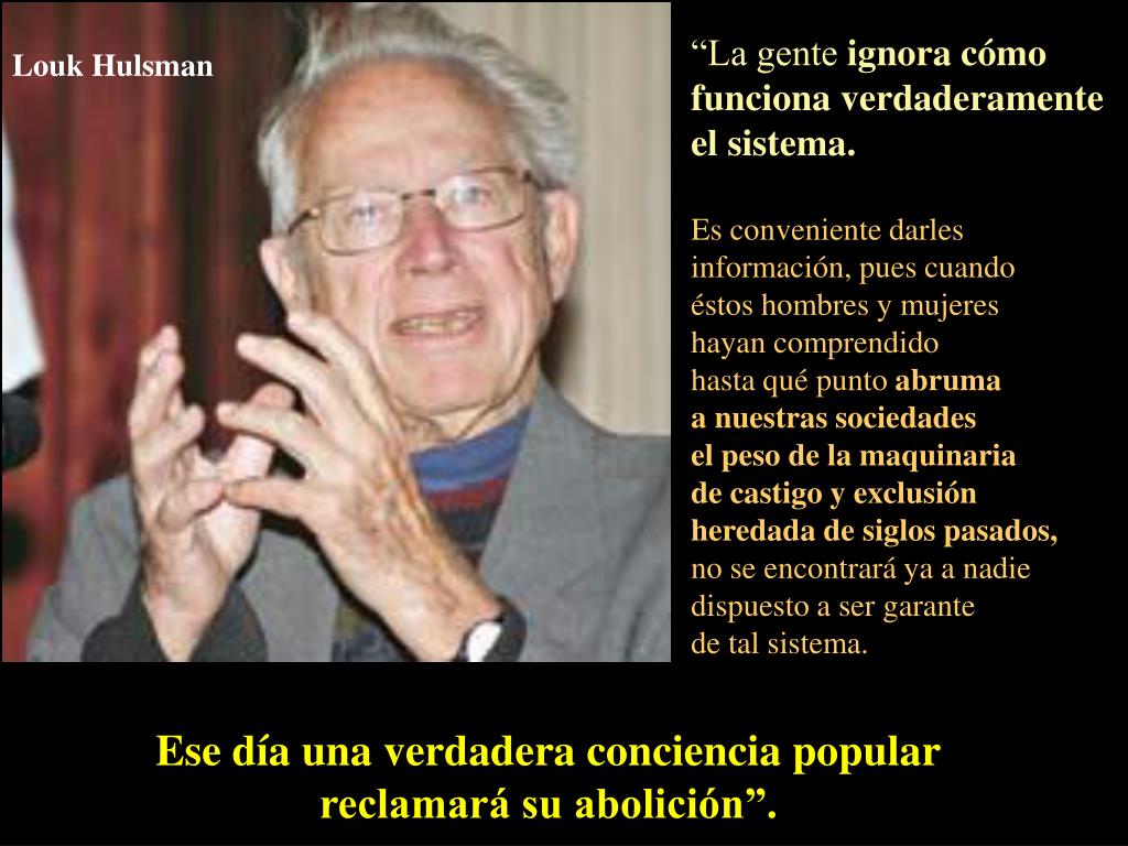 “La gente ignora cómo funciona verdaderamente el sistema. Es conveniente darles información, pues cuando éstos hombres y mujeres hayan comprendido hasta qué punto abruma a nuestras sociedades el peso de la maquinaria de castigo y exclusión heredada de siglos pasados, no se encontrará ya a nadie dispuesto a ser garante de tal sistema. Louk Hulsman Ese día una verdadera conciencia popular reclamará su abolición”.