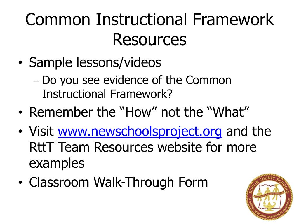 Common Instructional FrameworkResources • Sample lessons/videos • Do you see evidence of the Common Instructional Framework? • Remember the “How” not the “What” • Visit www.newschoolsproject.org and the RttT Team Resources website for more examples • Classroom Walk-Through Form