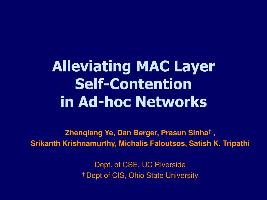 Alleviating MAC Layer Self-Contention in Ad-hoc Networks Zhenqiang Ye, Dan Berger, Prasun Sinha† , Srikanth Krishnamurthy, Michalis Faloutsos, Satish K. Tripathi Dept. of CSE, UC Riverside † Dept of CIS, Ohio State University