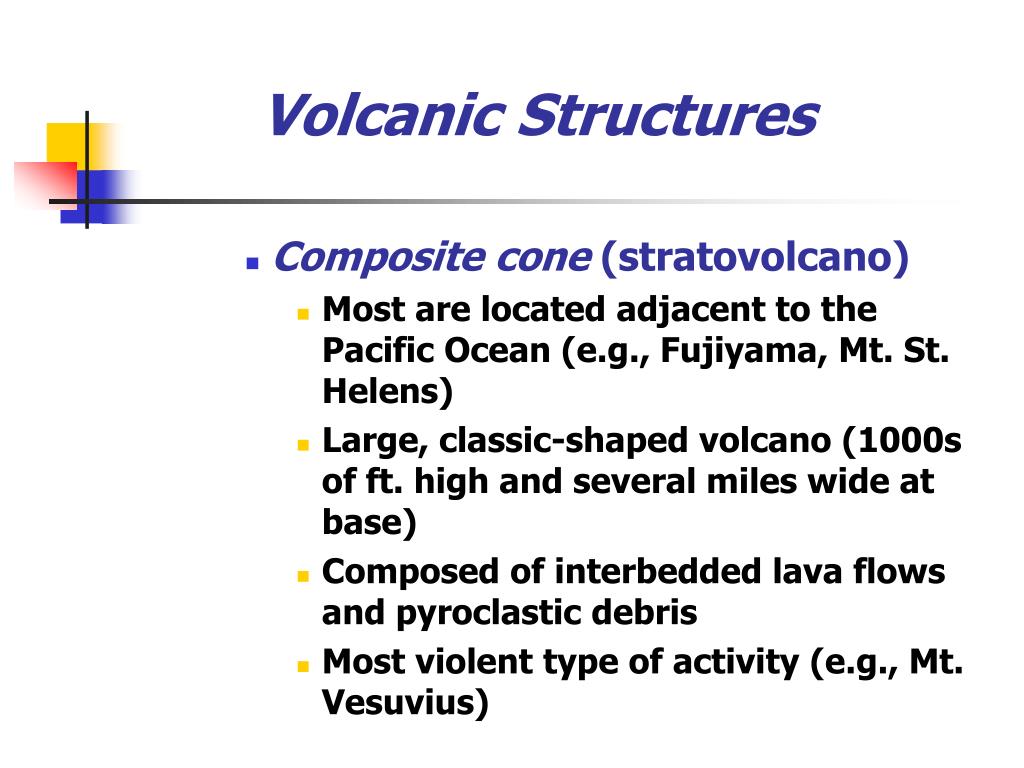 Volcanic Structures • Composite cone (stratovolcano) • Most are located adjacent to the Pacific Ocean (e.g., Fujiyama, Mt. St. Helens) • Large, classic-shaped volcano (1000s of ft. high and several miles wide at base) • Composed of interbedded lava flows and pyroclastic debris • Most violent type of activity (e.g., Mt. Vesuvius)