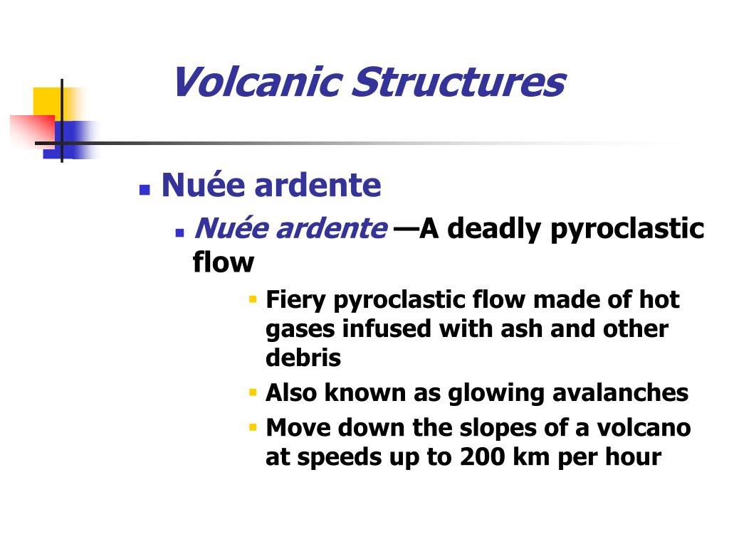 Volcanic Structures • Nuée ardente • Nuée ardente—A deadly pyroclastic flow • Fiery pyroclastic flow made of hot gases infused with ash and other debris • Also known as glowing avalanches • Move down the slopes of a volcano at speeds up to 200 km per hour