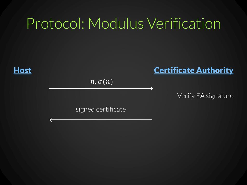 Overview TLS Host (e.g., web server) 1. Modulus generation 4. CA-signed certificate 2. EA-signed certificate 3. EA-signed certificate Certificate Authority Entropy Authority