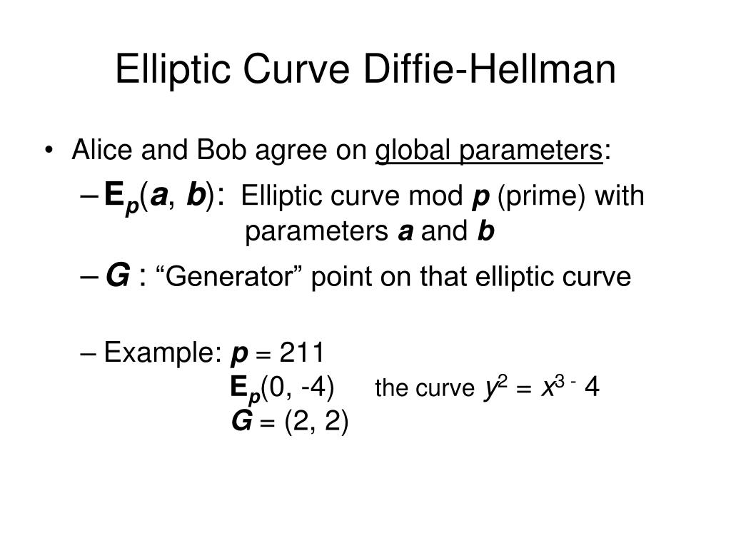 Elliptic Curve Diffie-Hellman • Alice and Bob agree on global parameters: • Ep(a, b): Elliptic curve mod p (prime) with parameters a and b • G : “Generator” point on that elliptic curve • Example: p = 211Ep(0, -4) the curvey2 = x3 - 4G = (2, 2)