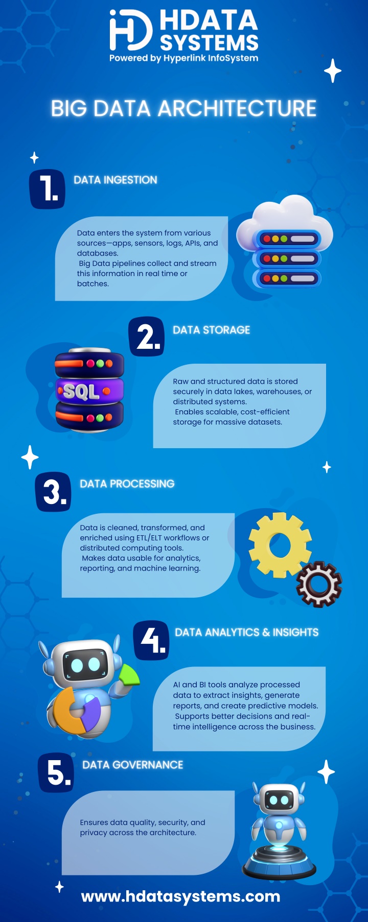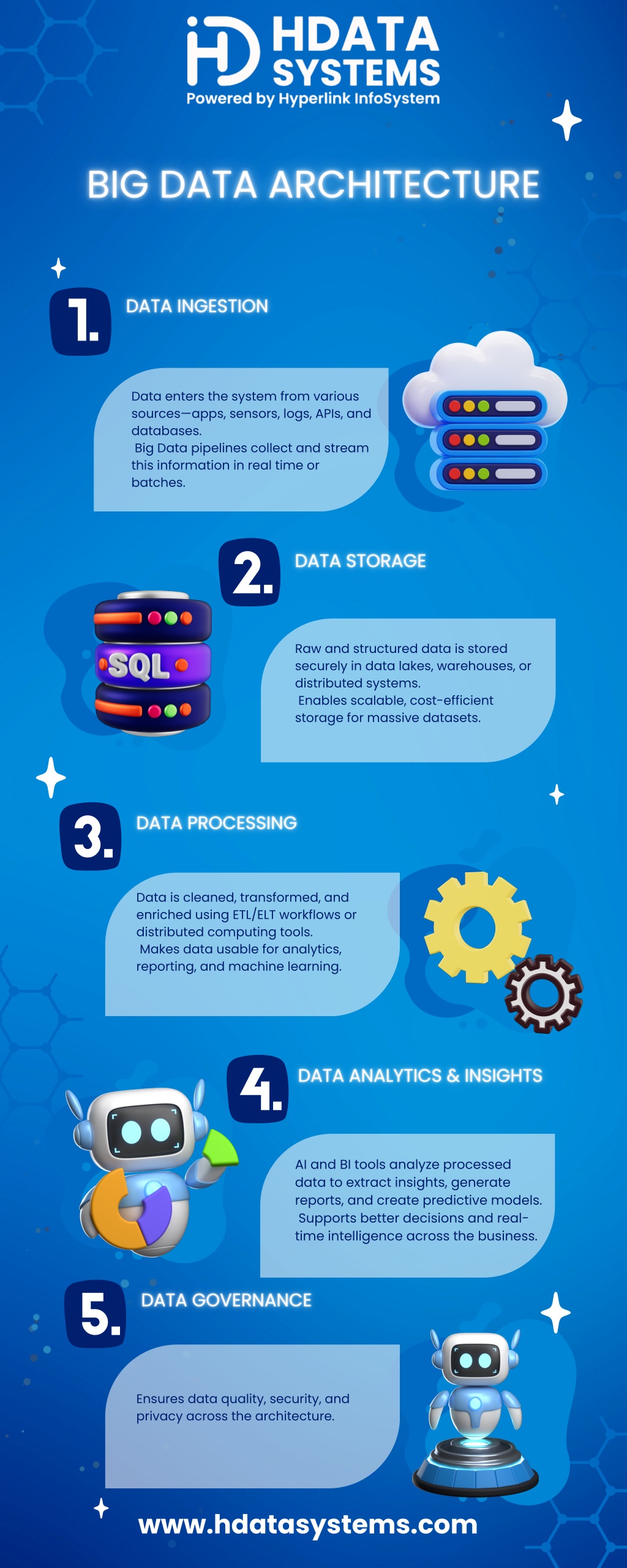 1. Data enters the system from various sources—apps, sensors, logs, APIs, and databases. Big Data pipelines collect and stream this information in real time or batches. 2. Raw and structured data is stored securely in data lakes, warehouses, or distributed systems. Enables scalable, cost-efficient storage for massive datasets. 3. Data is cleaned, transformed, and enriched using ETL/ELT workflows or distributed computing tools. Makes data usable for analytics, reporting, and machine learning. 4. AI and BI tools analyze processed data to extract insights, generate reports, and create predictive models. Supports better decisions and real- time intelligence across the business. 5. Ensures data quality, security, and privacy across the architecture. www.hdatasystems.com