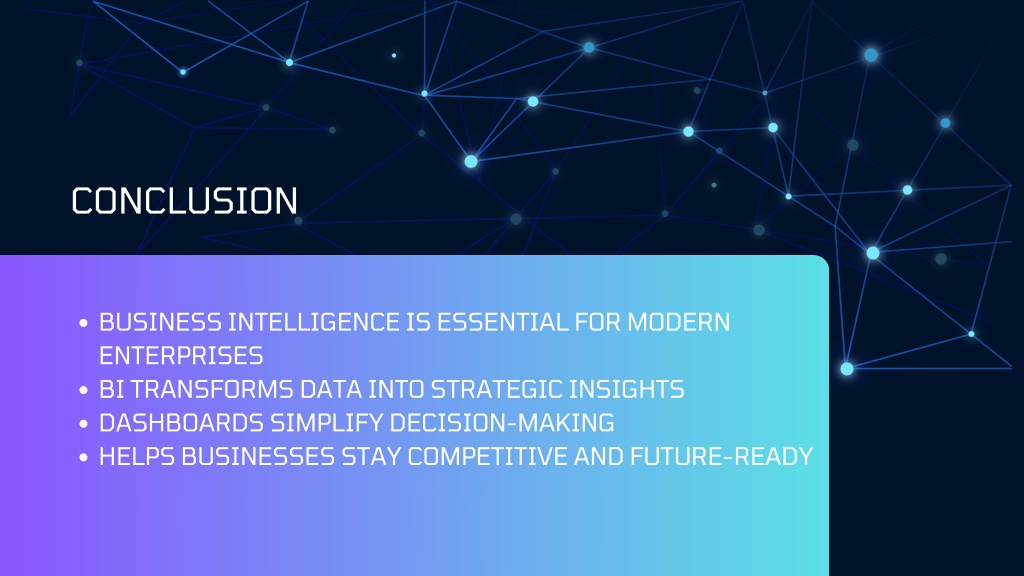CONCLUSION BUSINESS INTELLIGENCE IS ESSENTIAL FOR MODERN ENTERPRISES BI TRANSFORMS DATA INTO STRATEGIC INSIGHTS DASHBOARDS SIMPLIFY DECISION-MAKING HELPS BUSINESSES STAY COMPETITIVE AND FUTURE-READY