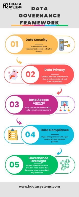 DATA GOVERNANCE FRAMEWORK Data Security 01 Protects data from unauthorized access and cyber threats. Data Privacy 02 Ensures personal and sensitive data is collected, stored, and used responsibly. Data Access Control 03 Uses role-based access (RBAC) and permission management. Data Compliance 04 Aligns data practices with legal, regulatory, and industry policies. Governance Oversight 05 Central governance team monitors rules, audits data flows, and ensures standards stay up to date. www.hdatasystems.com
