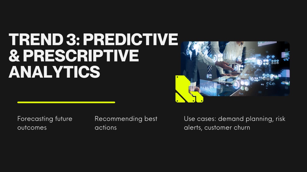 TREND 3: PREDICTIVE & PRESCRIPTIVE ANALYTICS Forecasting future outcomes Recommending best actions Use cases: demand planning, risk alerts, customer churn