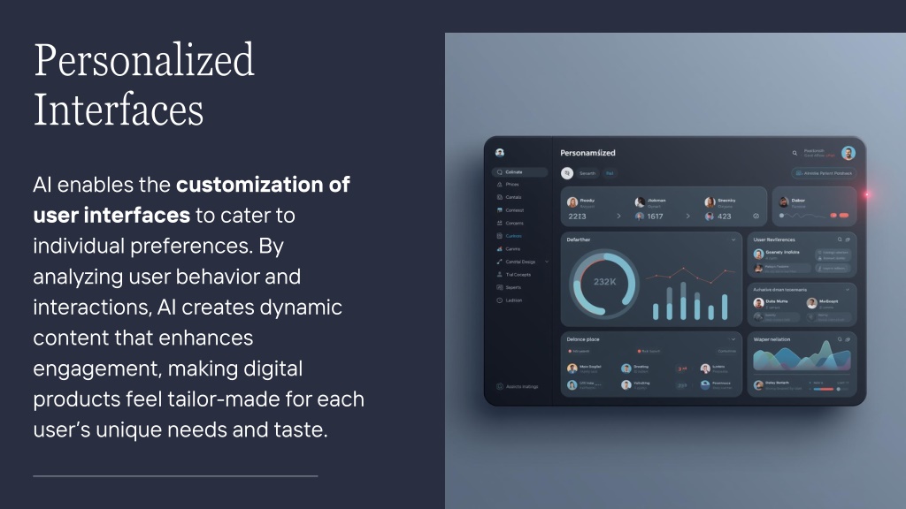 6. Personalized Interfaces AI enables the customization of user interfaces to cater to individual preferences. By analyzing user behavior and interactions, AI creates dynamic content that enhances engagement, making digital products feel tailor-made for each user’s unique needs and taste.