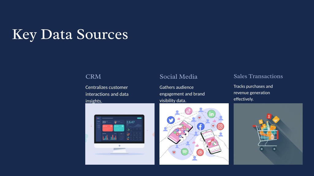 5. Key Data Sources CRM Social Media Sales Transactions Tracks purchases and revenue generation effectively. Centralizes customer interactions and data insights. Gathers audience engagement and brand visibility data.