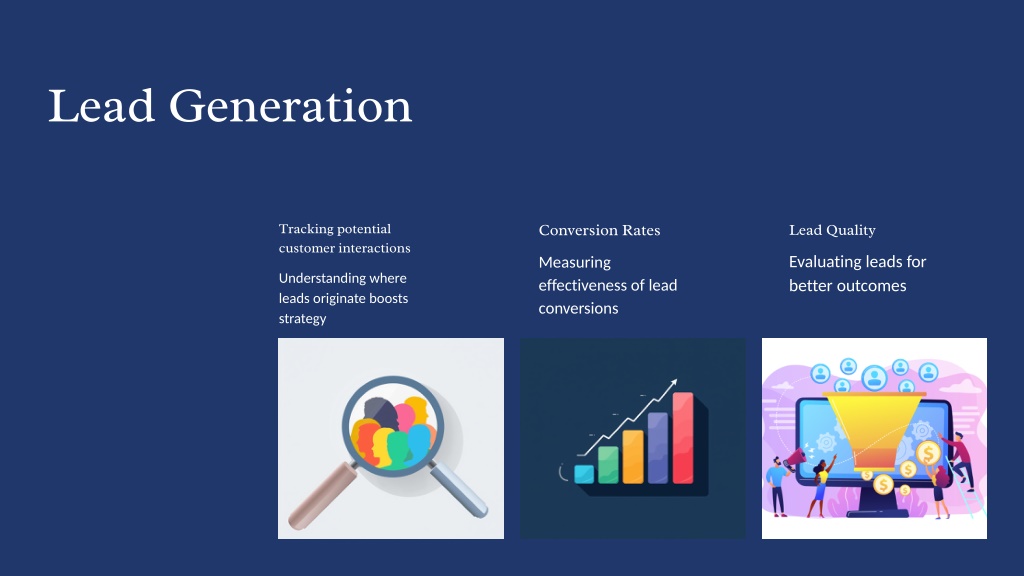 8. Lead Generation Conversion Rates Tracking potential customer interactions Lead Quality Evaluating leads for better outcomes Measuring effectiveness of lead conversions Understanding where leads originate boosts strategy