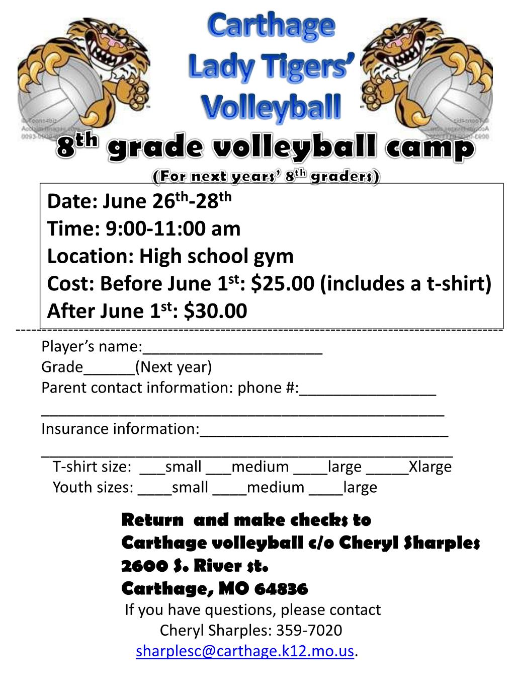 Carthage Lady Tigers’ Volleyball Next years’ 5th and 6th graders Date: June 26th-28th Time: 11:30-1:00 am Location: High school gym Cost: Early registration:$20.00 (includes a t-shirt) By June 1st. After June 1st: $25.00 Player’s name:____________________grade______ Parent contact information: phone #:________________ _______________________________________________ Insurance information:_____________________________ ________________________________________________ T-shirt size: ___small ___medium ____large _____Xlarge Youth sizes: ____small ____medium ____large Return to and make checks to Carthage volleyball c/o Cheryl Sharples 2600 S. River st. Carthage, MO 64836 If you have questions, please contact Cheryl Sharples: 359-7020 sharplesc@carthage.k12.m