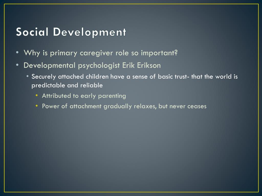 Social Development • Why is primary caregiver role so important? • Developmental psychologist Erik Erikson • Securely attached children have a sense of basic trust- that the world is predictable and reliable • Attributed to early parenting • Power of attachment gradually relaxes, but never ceases
