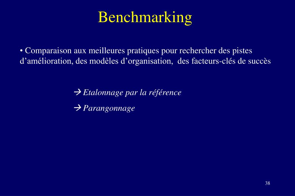 Benchmarking • Comparaison aux meilleures pratiques pour rechercher des pistes d’amélioration, des modèles d’organisation, des facteurs-clés de succès • Etalonnage par la référence • Parangonnage