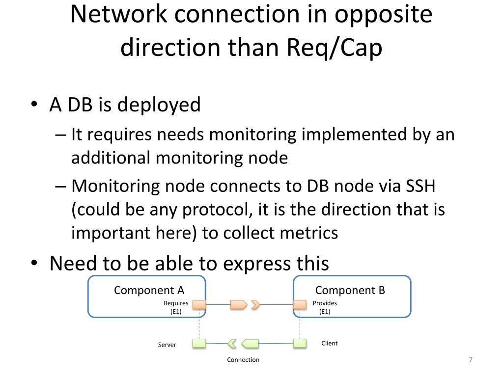 Network connection in opposite direction than Req/Cap • A DB is deployed • It requires needs monitoring implemented by an additional monitoring node • Monitoring node connects to DB node via SSH (could be any protocol, it is the direction that is important here) to collect metrics • Need to be able to express this Component A Component B Requires (E1) Provides (E1) Client Server Connection