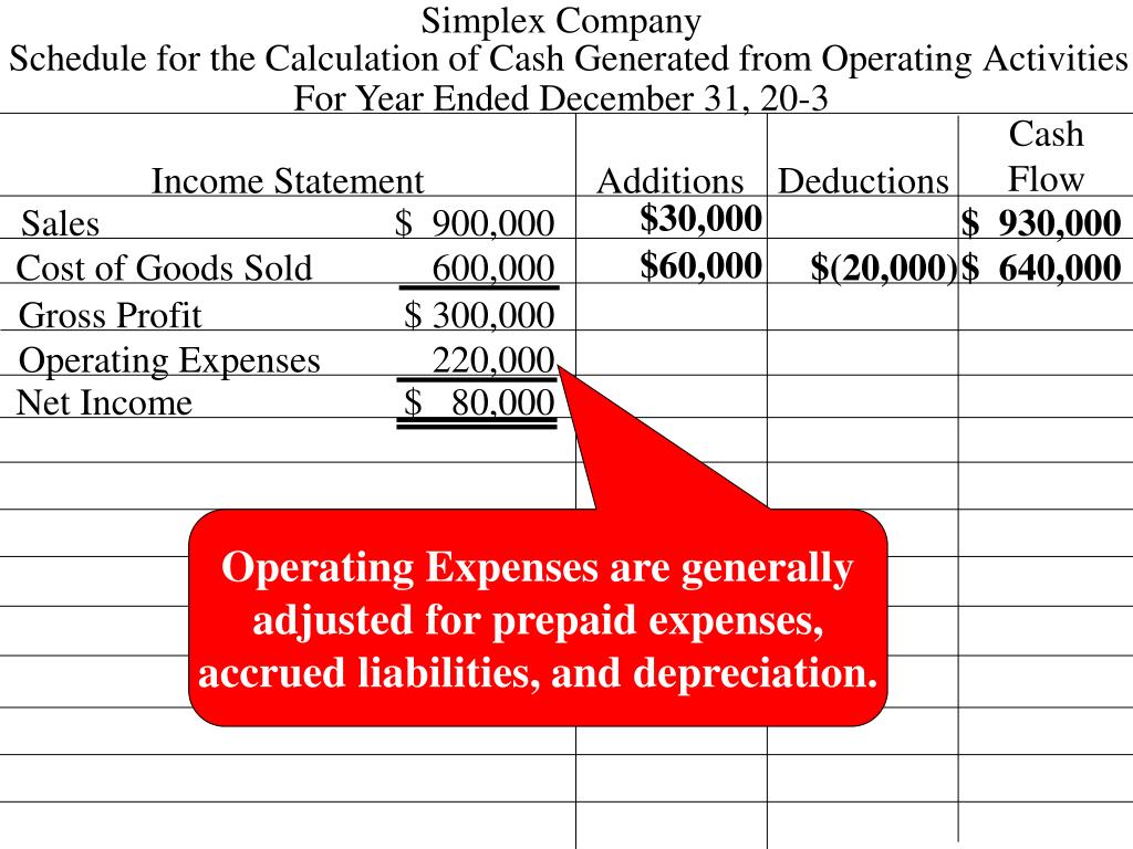 Simplex Company Schedule for the Calculation of Cash Generated from OperatingActivities For Year Ended December 31, 20-3 Cash Flow Income Statement Additions Deductions $30,000 Sales $ 900,000 $ 930,000 $60,000 Cost of Goods Sold 600,000 $(20,000) $ 640,000 Gross Profit $ 300,000 Operating Expenses 220,000 220,000 Net Income $ 80,000 Simplex does not have any of these items , so there is no need to adjust operating expenses.