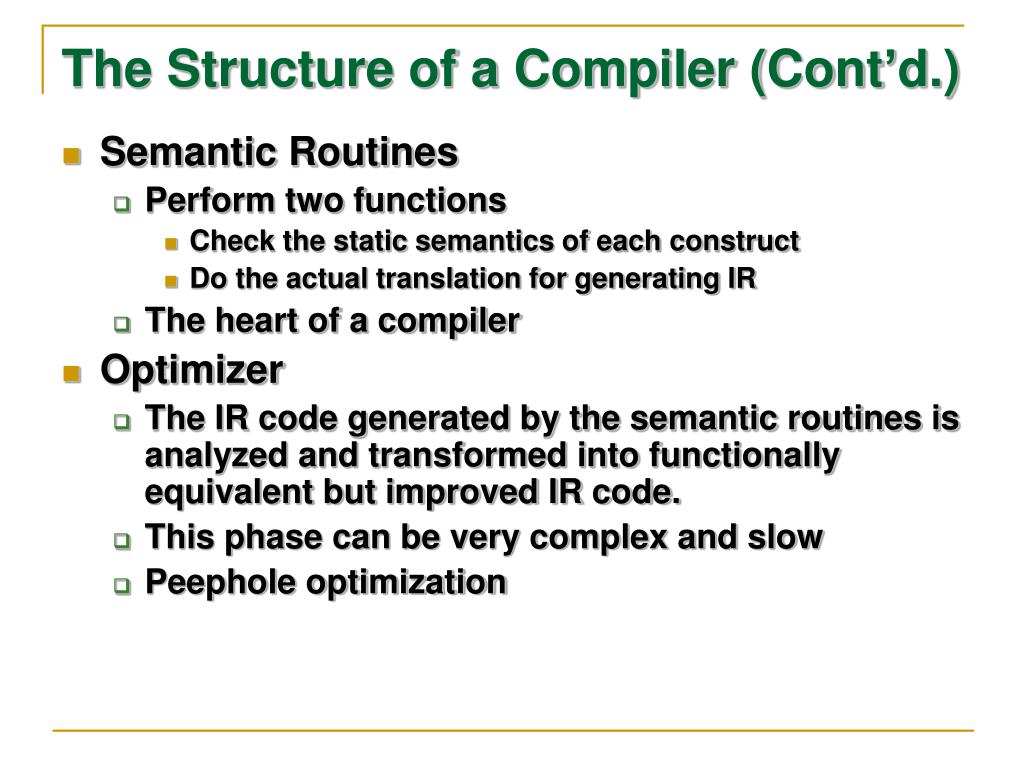 The Structure of a Compiler (Cont’d.) • Semantic Routines • Perform two functions • Check the static semantics of each construct • Do the actual translation for generating IR • The heart of a compiler • Optimizer • The IR code generated by the semantic routines is analyzed and transformed into functionally equivalent but improved IR code. • This phase can be very complex and slow • Peephole optimization