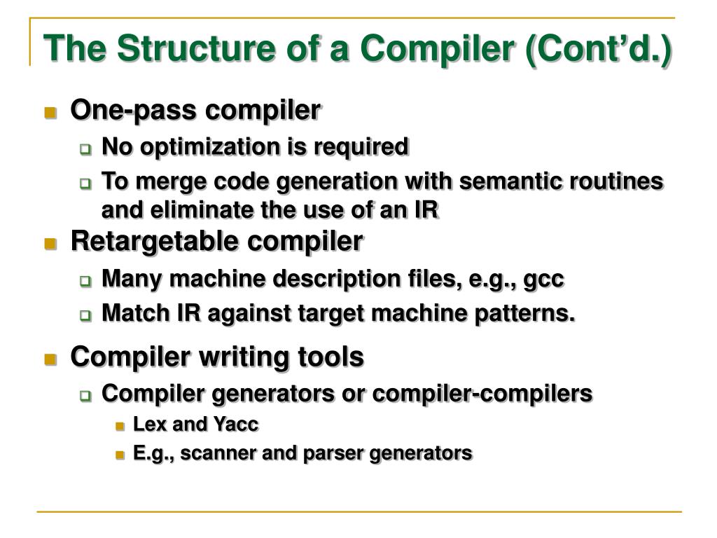 The Structure of a Compiler (Cont’d.) • One-pass compiler • No optimization is required • To merge code generation with semantic routines and eliminate the use of an IR • Retargetable compiler • Many machine description files, e.g., gcc • Match IR against target machine patterns. • Compiler writing tools • Compiler generators or compiler-compilers • Lex and Yacc • E.g., scanner and parser generators