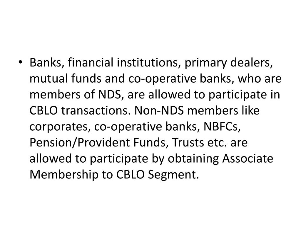 Banks, financial institutions, primary dealers, mutual funds and co-operative banks, who are members of NDS, are allowed to participate in CBLO transactions. Non-NDS members like corporates, co-operative banks, NBFCs, Pension/Provident Funds, Trusts etc. are allowed to participate by obtaining Associate Membership to CBLO Segment.