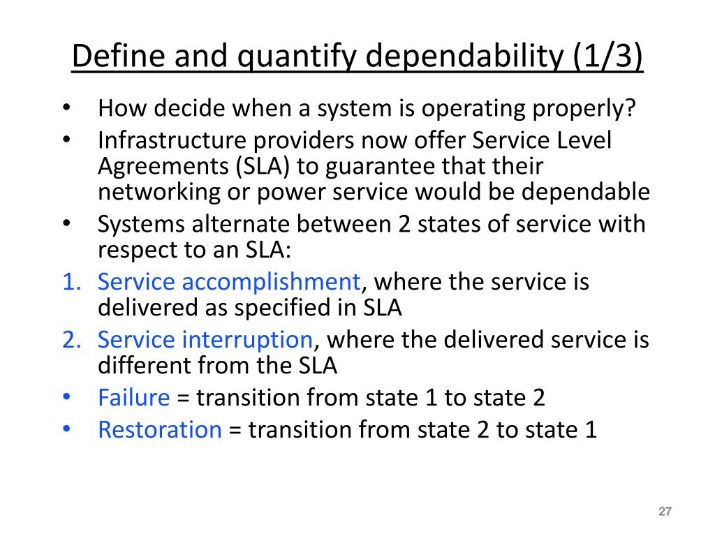 Define and quantify dependability (1/3) • How decide when a system is operating properly? • Infrastructure providers now offer Service Level Agreements (SLA) to guarantee that their networking or power service would be dependable • Systems alternate between 2 states of service with respect to an SLA: • Service accomplishment, where the service is delivered as specified in SLA • Service interruption, where the delivered service is different from the SLA • Failure = transition from state 1 to state 2 • Restoration = transition from state 2 to state 1