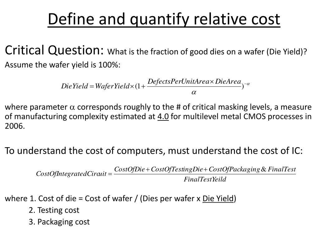 Define and quantify relative cost Critical Question: What is the fraction of good dies on a wafer (Die Yield)? Assume the wafer yield is 100%: where parameter corresponds roughly to the # of critical masking levels, a measure of manufacturing complexity estimated at 4.0 for multilevel metal CMOS processes in 2006. To understand the cost of computers, must understand the cost of IC: where 1. Cost of die = Cost of wafer / (Dies per wafer x Die Yield) 2. Testing cost 3. Packaging cost