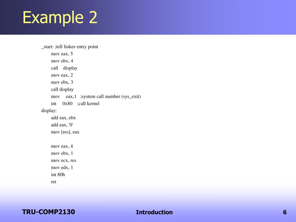 Example 2 _start: ;tell linker entry point moveax, 5 movebx, 4 call display moveax, 2 movebx, 3 call display mov eax,1 ;system call number (sys_exit) int 0x80 ;call kernel display: add eax, ebx add eax, '0' mov [res], eax moveax, 4 movebx, 1 movecx, res movedx, 1 int 80h ret Introduction