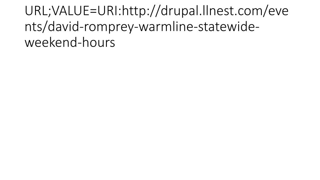 URL;VALUE=URI:http://drupal.llnest.com/events/david-romprey-warmline-statewide-weekend-hoursURL;VALUE=URI:http://drupal.llnest.com/events/david-romprey-warmline-statewide-weekend-hours