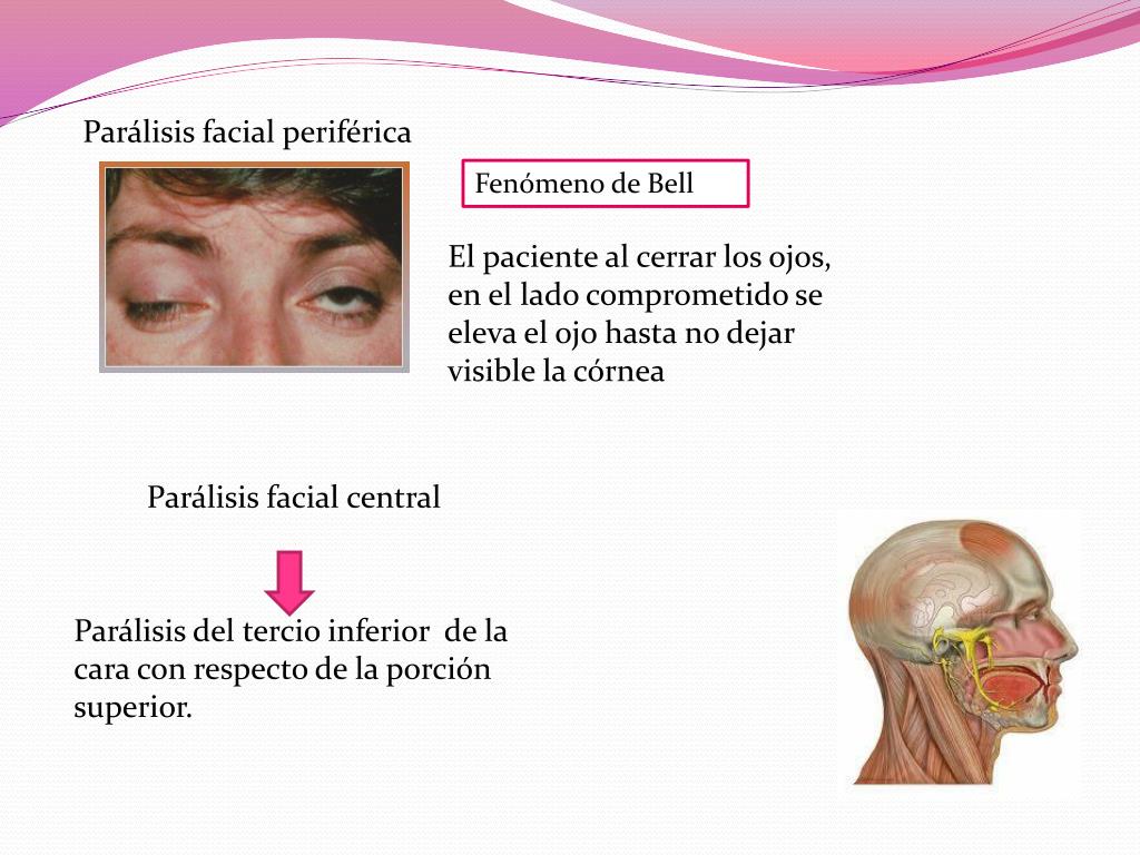 Parálisis facial periférica Fenómeno de Bell El paciente al cerrar los ojos, en el lado comprometido se eleva el ojo hasta no dejar visible la córnea Parálisis facial central Parálisis del tercio inferior de la cara con respecto de la porción superior.
