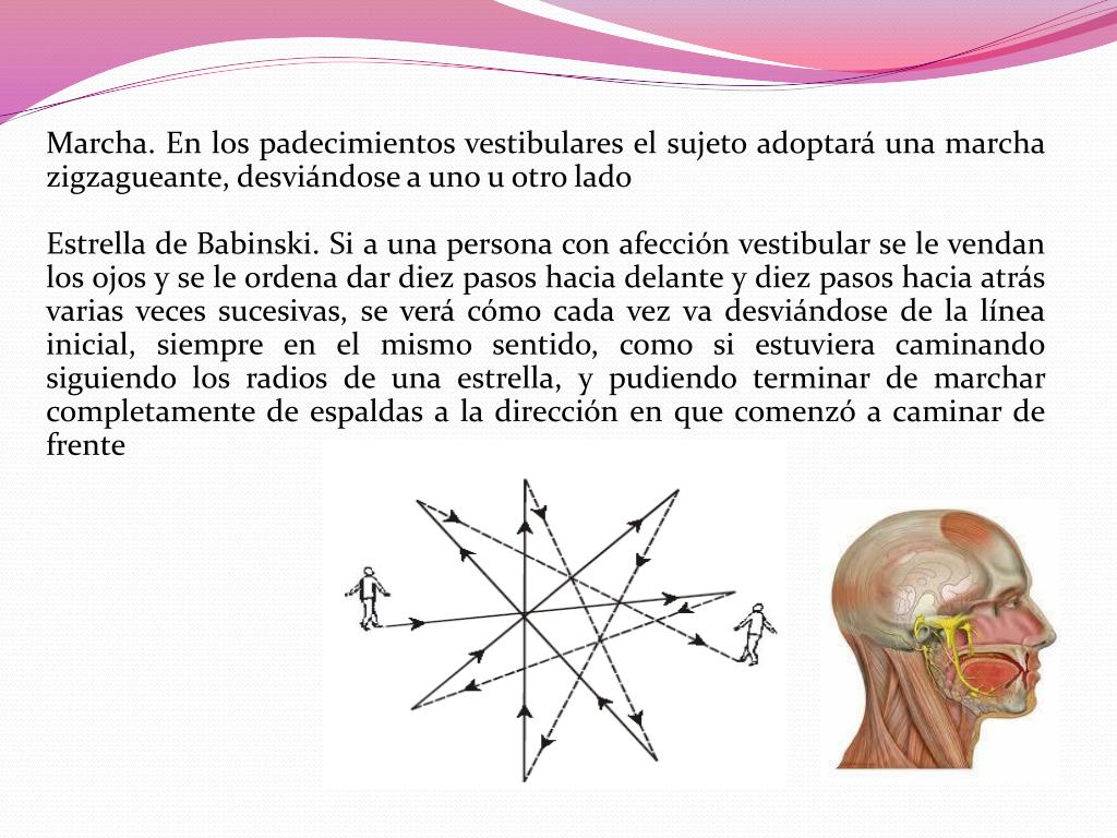 Marcha. En los padecimientos vestibulares el sujeto adoptará una marcha zigzagueante, desviándose a uno u otro lado Estrella de Babinski. Si a una persona con afección vestibular se le vendan los ojos y se le ordena dar diez pasos hacia delante y diez pasos hacia atrás varias veces sucesivas, se verá cómo cada vez va desviándose de la línea inicial, siempre en el mismo sentido, como si estuviera caminando siguiendo los radios de una estrella, y pudiendo terminar de marchar completamente de espaldas a la dirección en que comenzó a caminar de frente