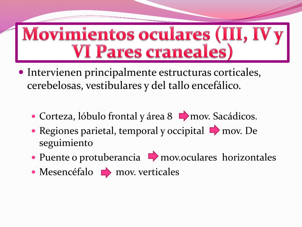 Movimientos oculares (III, IV y VI Pares craneales) • Intervienen principalmente estructuras corticales, cerebelosas, vestibulares y del tallo encefálico. • Corteza, lóbulo frontal y área 8 mov. Sacádicos. • Regiones parietal, temporal y occipital mov. De seguimiento • Puente o protuberancia mov.oculares horizontales • Mesencéfalo mov. verticales