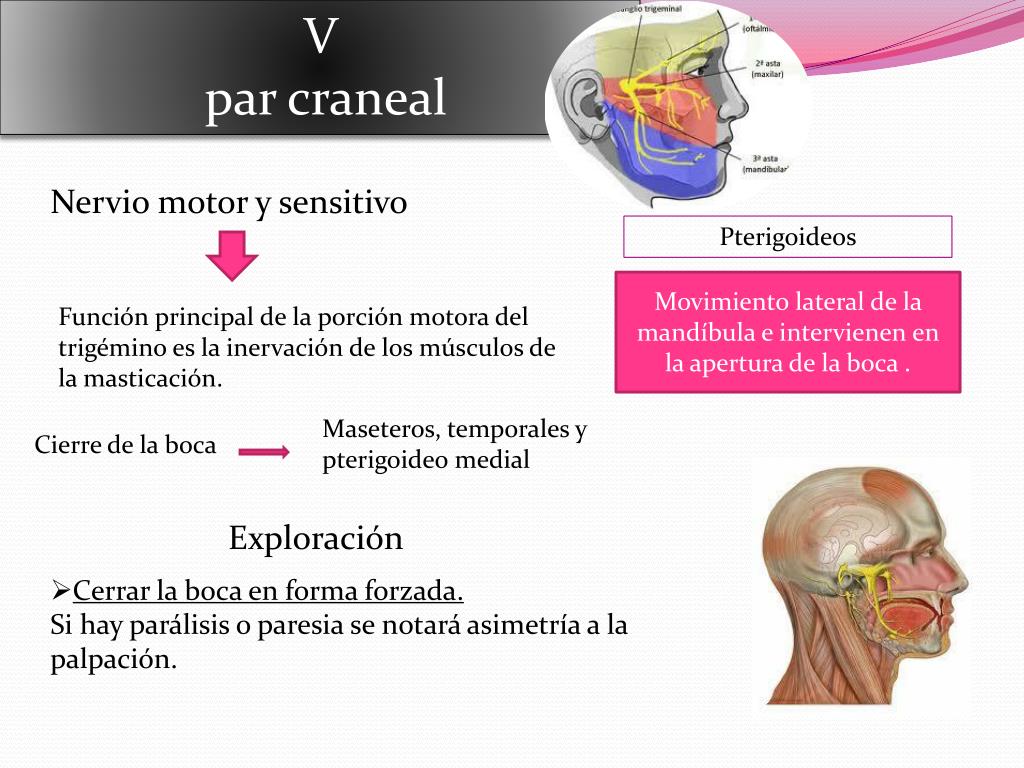 V par craneal Nervio motor y sensitivo Pterigoideos Movimiento lateral de la mandíbula e intervienen en la apertura de la boca . Función principal de la porción motora del trigémino es la inervación de los músculos de la masticación. Maseteros, temporales y pterigoideo medial Cierre de la boca Exploración • Cerrar la boca en forma forzada. • Si hay parálisis o paresia se notará asimetría a la palpación.