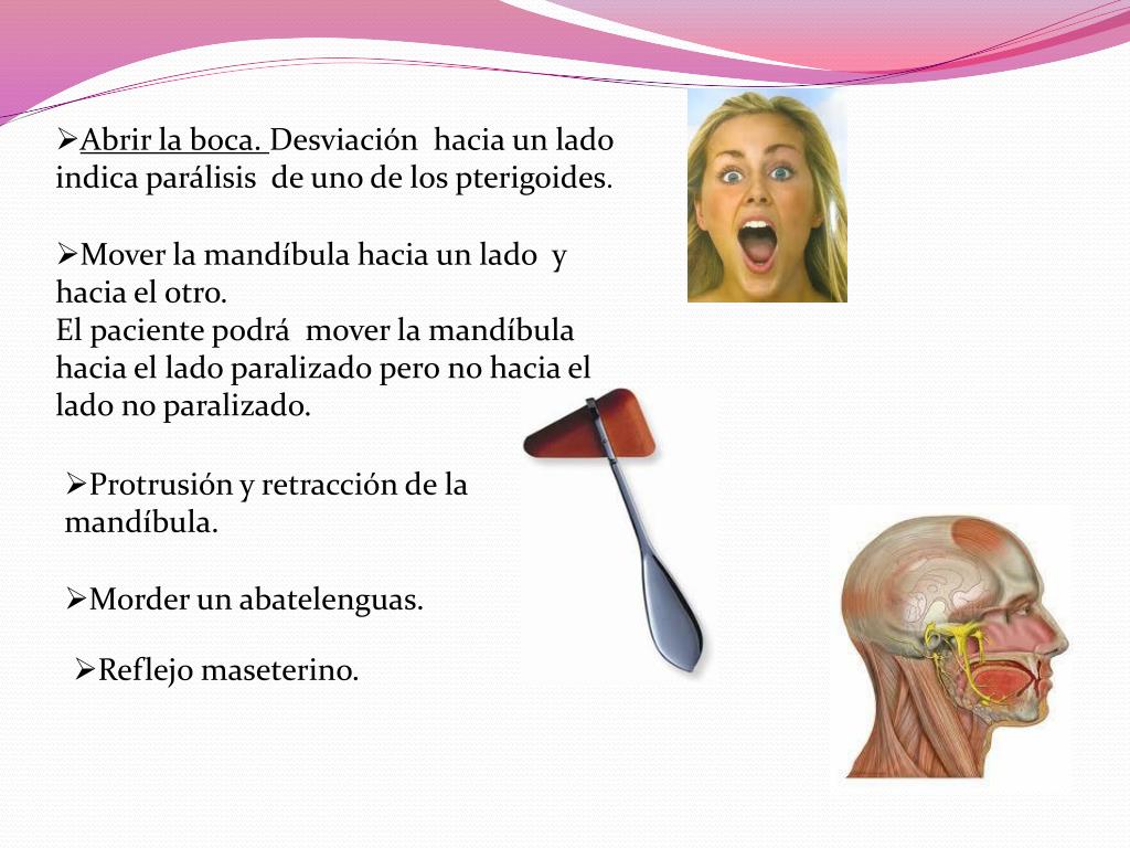 Abrir la boca. Desviación hacia un lado indica parálisis de uno de los pterigoides. • Mover la mandíbula hacia un lado y hacia el otro. • El paciente podrá mover la mandíbula hacia el lado paralizado pero no hacia el lado no paralizado. • Protrusión y retracción de la mandíbula. • Morder un abatelenguas. • Reflejo maseterino.