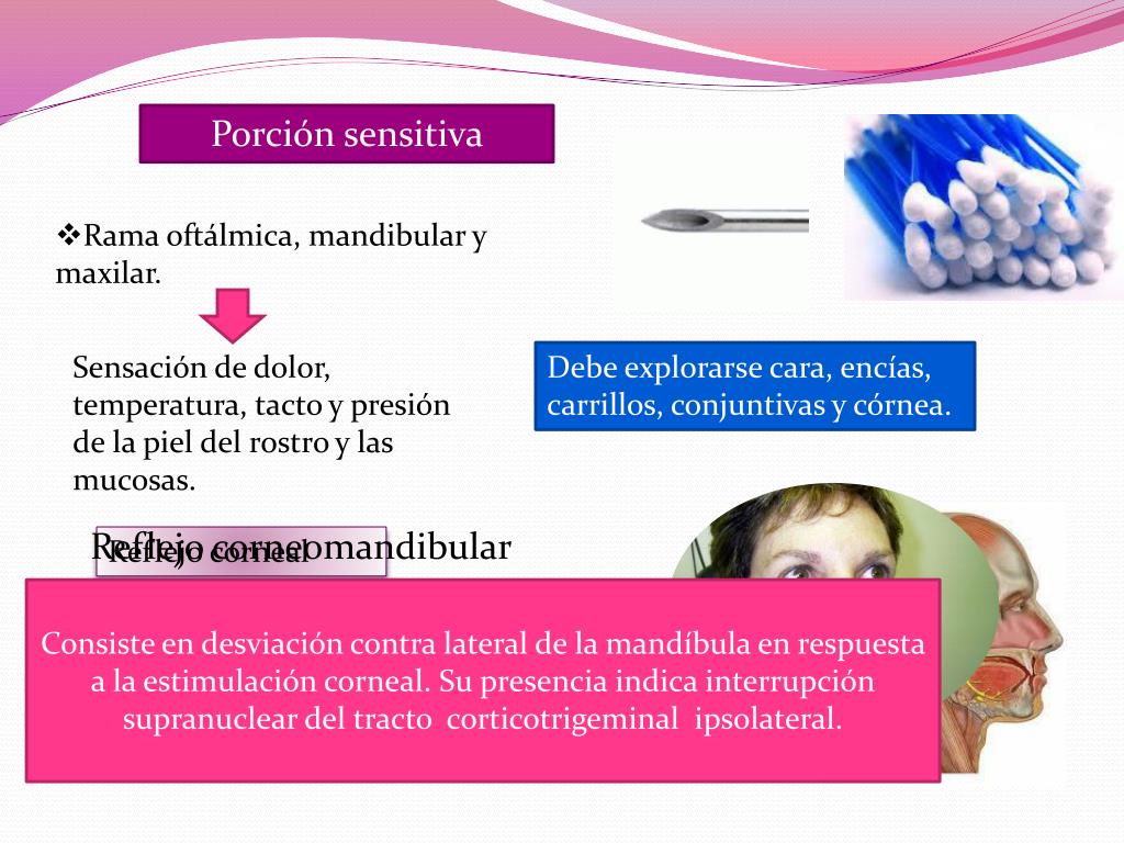 Porción sensitiva • Rama oftálmica, mandibular y maxilar. Sensación de dolor, temperatura, tacto y presión de la piel del rostro y las mucosas. Debe explorarse cara, encías, carrillos, conjuntivas y córnea. Reflejo corneomandibular Reflejo corneal Consiste en desviación contra lateral de la mandíbula en respuesta a la estimulación corneal. Su presencia indica interrupción supranuclear del tracto corticotrigeminal ipsolateral. Utilizando un hilo de algodón húmedo, se le pide al paciente que mire hacia un lado mientras se estimula la córnea, la respuesta debe ser el cierre palpebral.