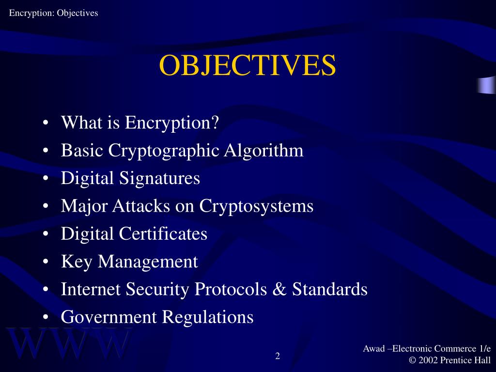 Encryption: Objectives OBJECTIVES • What is Encryption? • Basic Cryptographic Algorithm • Digital Signatures • Major Attacks on Cryptosystems • Digital Certificates • Key Management • Internet Security Protocols & Standards • Government Regulations