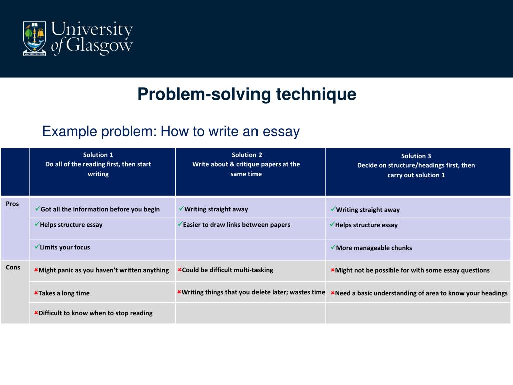 Problem-solving technique Solution 1 Do all of the reading first, then start writing Solution 2 Write about & critique papers at the same time Solution 3 Decide on structure/headings first, then carry out solution 1 Writing straight away Got all the information before you begin Writing straight away Easier to draw links between papers Helps structure essay Helps structure essay Example problem: How to write an essay Limits your focus More manageable chunks Could be difficult multi-tasking Might panic as you haven’t written anything Might not be possible for with some essay questions Writing things that you delete later; wastes time Takes a long time Need a basic understanding of area to know your headings Difficult to know when to stop reading
