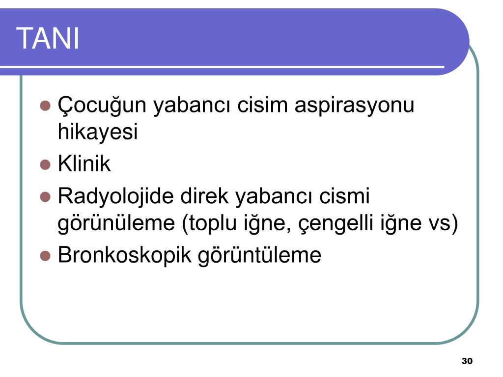 TANI • Çocuğun yabancı cisim aspirasyonu hikayesi • Klinik • Radyolojide direk yabancı cismi görünüleme (toplu iğne, çengelli iğne vs) • Bronkoskopik görüntüleme