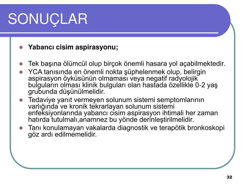 SONUÇLAR • Yabancıcisimaspirasyonu; • Tek başına ölümcül olup birçok önemli hasara yol açabilmektedir. • YCA tanısında en önemli nokta şüphelenmek olup, belirgin aspirasyon öyküsünün olmaması veya negatif radyolojik bulguların olması klinik bulguları olan hastada özellikle 0-2 yaş grubunda düşünülmelidir. • Tedaviye yanıt vermeyen solunum sistemi semptomlarının varlığında ve kronik tekrarlayan solunum sistemi enfeksiyonlarında yabancı cisim aspirasyon ihtimali her zaman hatırda tutulmalı,anamnez bu yönde derinleştirilmelidir. • Tanı konulamayan vakalarda diagnostik ve terapötik bronkoskopi göz ardı edilmemelidir.
