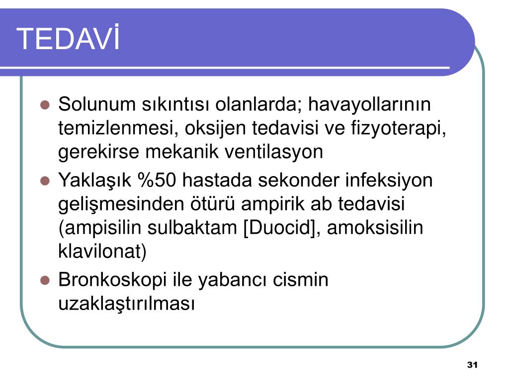 TEDAVİ • Solunum sıkıntısı olanlarda; havayollarının temizlenmesi, oksijen tedavisi ve fizyoterapi, gerekirse mekanik ventilasyon • Yaklaşık %50 hastada sekonder infeksiyon gelişmesinden ötürü ampirik ab tedavisi (ampisilin sulbaktam [Duocid], amoksisilin klavilonat) • Bronkoskopi ile yabancı cismin uzaklaştırılması