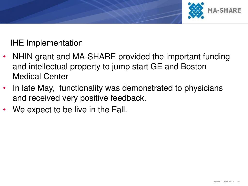 IHE Implementation NHIN grant and MA-SHARE provided the important funding and intellectual property to jump start GE and Boston Medical Center In late May, functionality was demonstrated to physicians and received very positive feedback. We expect to be live in the Fall.