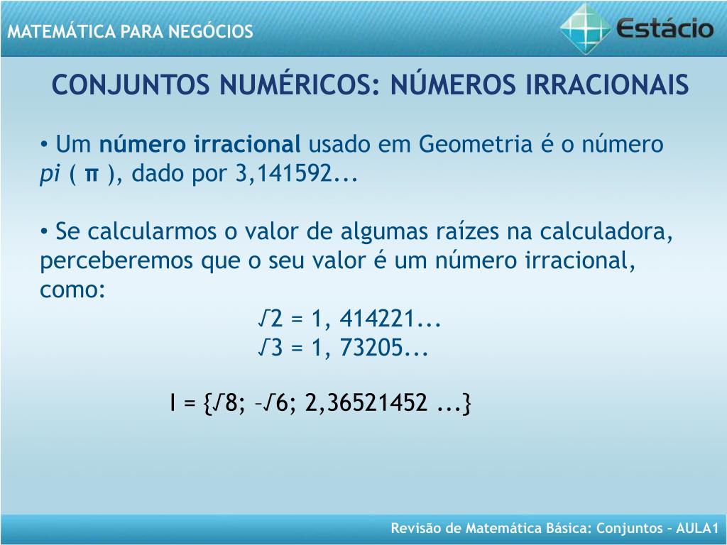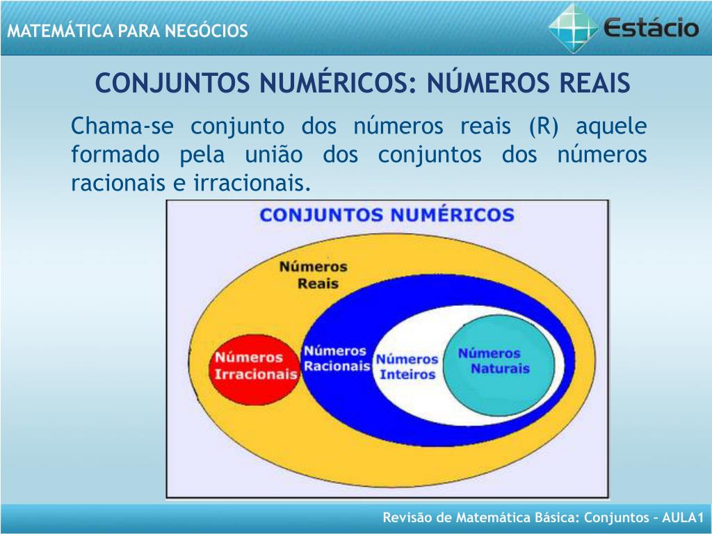 MATEMÁTICA PARA NEGÓCIOS. Aula 1- Revisão de Conjuntos. MATEMÁTICA PARA NEGÓCIOS Revisão de Matemática Básica (Aulas 1, 2 e 3). CONTEÚDO PROGRAMÁTICO DESTA AULA. Cojuntos Numéricos União de Conjuntos Intersecção entre Conjuntos Diagrama de Venn. DE OLHO NA IMAGEM.