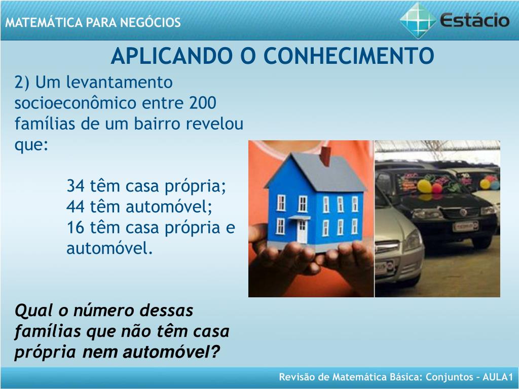 APLICANDO O CONHECIMENTO 2) Um levantamento socioeconômico entre 200 famílias de um bairro revelou que: 34 têm casa própria; 44 têm automóvel; 16 têm casa própria e automóvel. Qual o número dessas famílias que não têm casa própria nem automóvel?